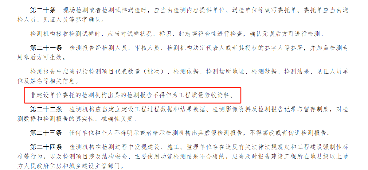 中華人民共和國住房和城鄉(xiāng)建設(shè)部發(fā)布的《建設(shè)工程質(zhì)量檢測(cè)管理辦法》第二十一條明確非建設(shè)單位委托的檢測(cè)機(jī)構(gòu)出具的檢測(cè)報(bào)告不得作為工程質(zhì)量驗(yàn)收資料。