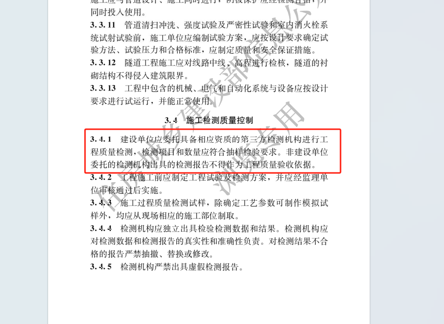 住房和城鄉(xiāng)建設(shè)部關(guān)于發(fā)布國家標(biāo)準(zhǔn)《建筑與市政工程施工質(zhì)量控制通用規(guī)范》的3.4.1 建設(shè)單位應(yīng)委托具備相應(yīng)資質(zhì)的第三方檢測(cè)機(jī)構(gòu)進(jìn)行工程質(zhì)量檢測(cè),檢測(cè)項(xiàng)目和數(shù)量應(yīng)符合抽樣檢驗(yàn)要求。非建設(shè)單位委托的檢測(cè)機(jī)構(gòu)出具的檢測(cè)報(bào)告不得作為工程質(zhì)量驗(yàn)收依據(jù)。